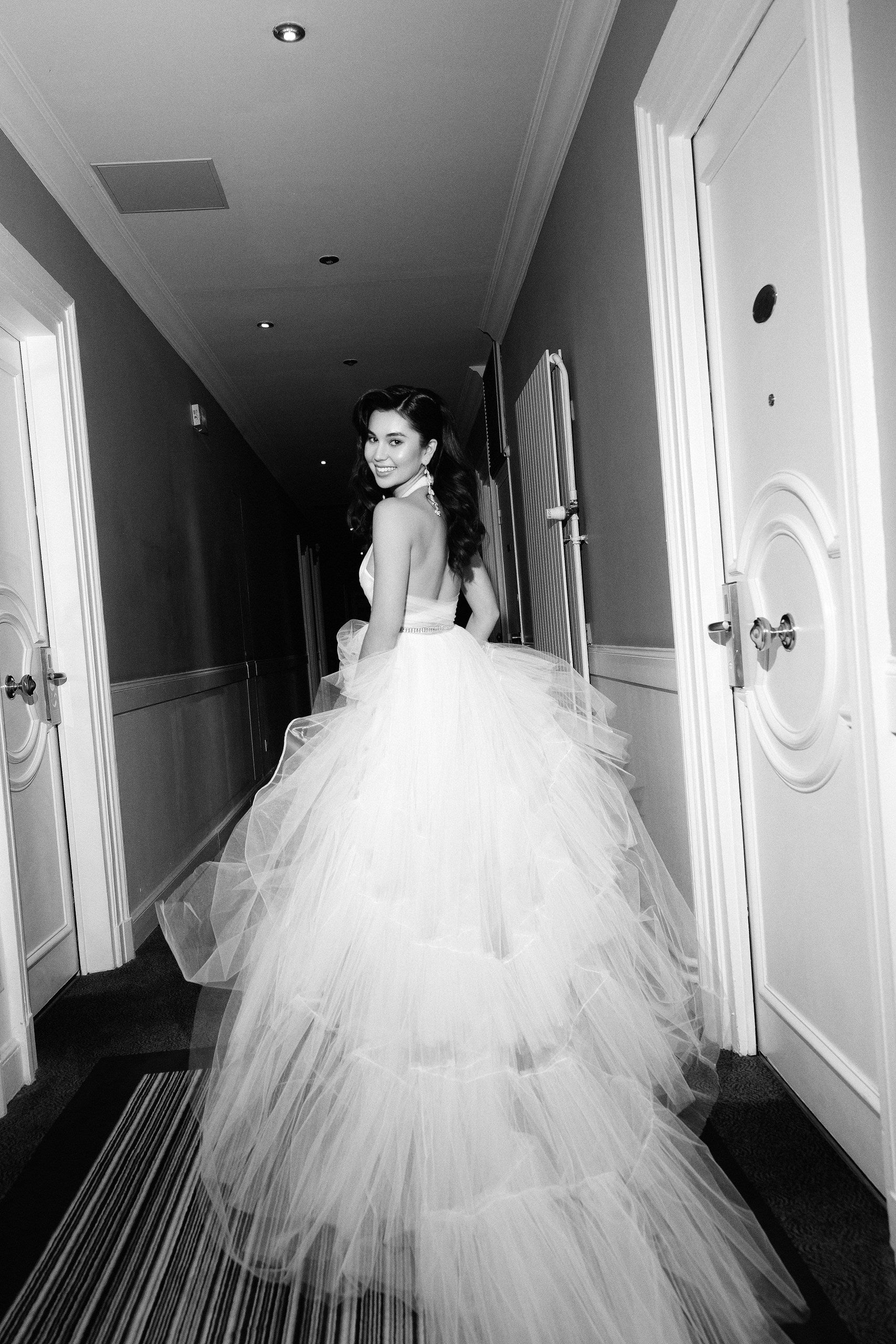 Quintessence du romantisme, la robe Memory entièrement réalisée dans une succession de volants de tulle. Dans un esprit couture, Adelina a choisi de souligner sa taille avec une fine ceinture de strass.