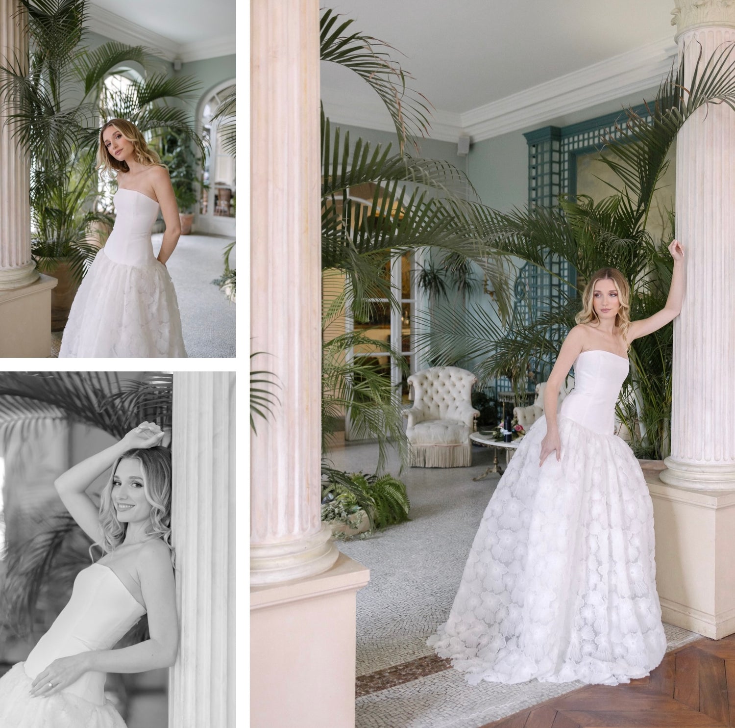 Notre mariée, éblouissante dans la robe Heaven s'offre une parenthèse de douceur dans le jardin d'hiver du château du prieuré