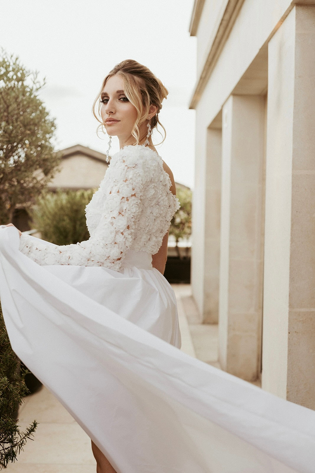 La robe Eole vous offre la possibilité de deux looks en un. Portée seule, il s'agit d'une robe courte one shoulder réalisée en tissu à fleurs effet 3D. Seconde option avec la surjupe longue en taffetas pour une apparition plus spectaculaire.