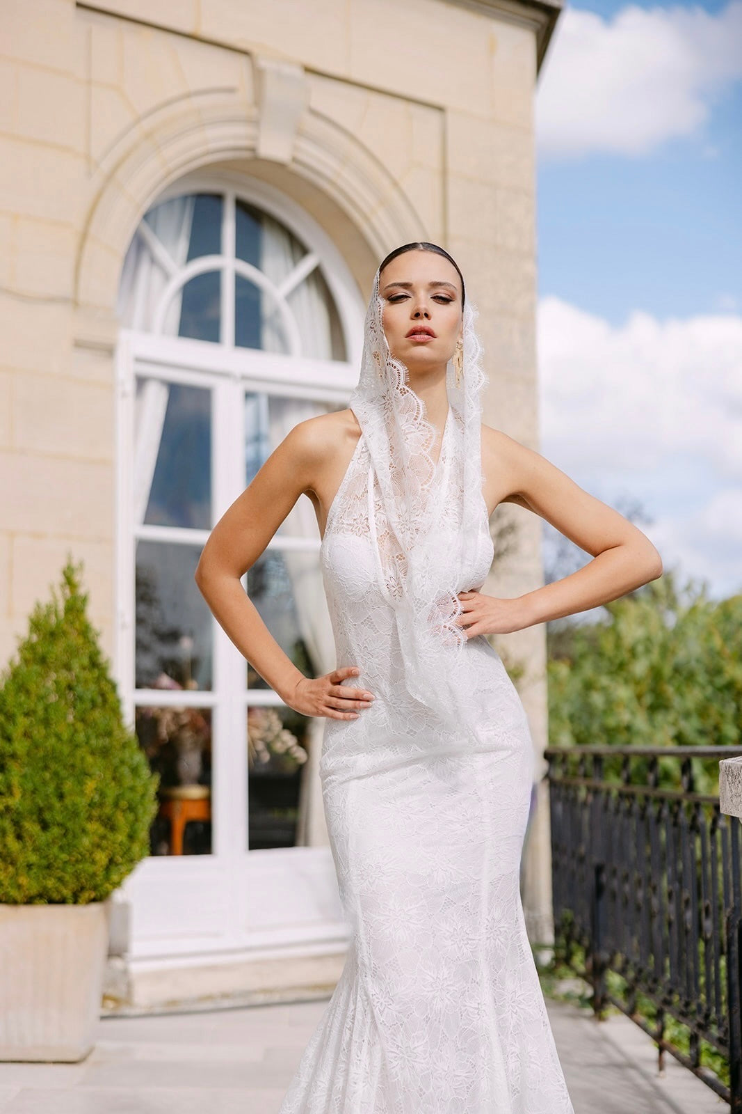 Entre apparition mystique ou disco queen, Icône est un modèle à l'allure inédite qui réconcilie tradition et avant-garde. Cousue dans une dentelle précieuse et légère la forme sirène met la silhouette en valeur de façon incomparable. La capuche en dentelle façon mantille peut se porter rabattue sur les épaules. Fermeture dans le dos et petits boutons en perle tout le long de la traine. Pour plus de maintien et un confort optimal, des coques sont intégrées au décolleté ainsi qu'une doublure lingerie légèrement extensible.