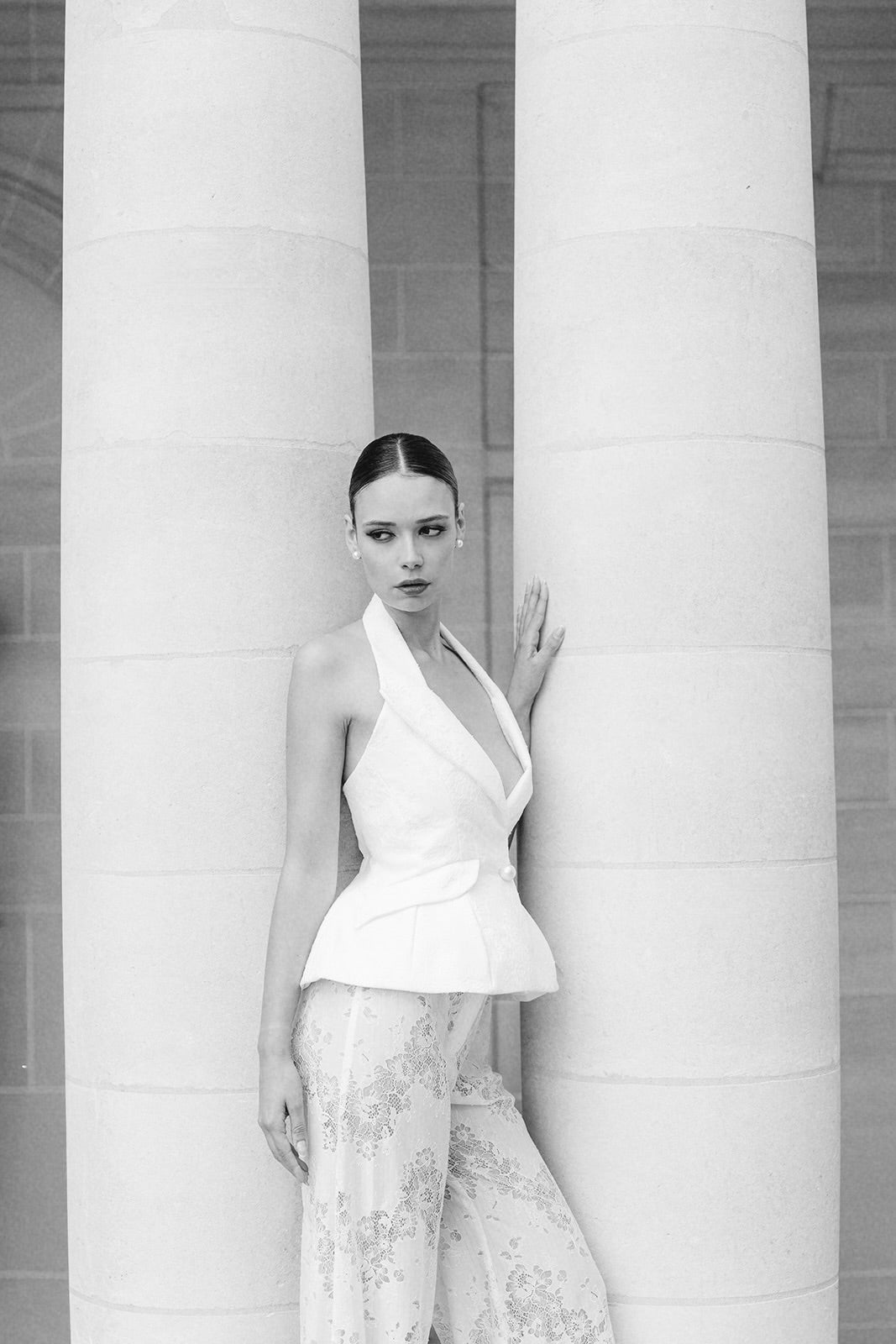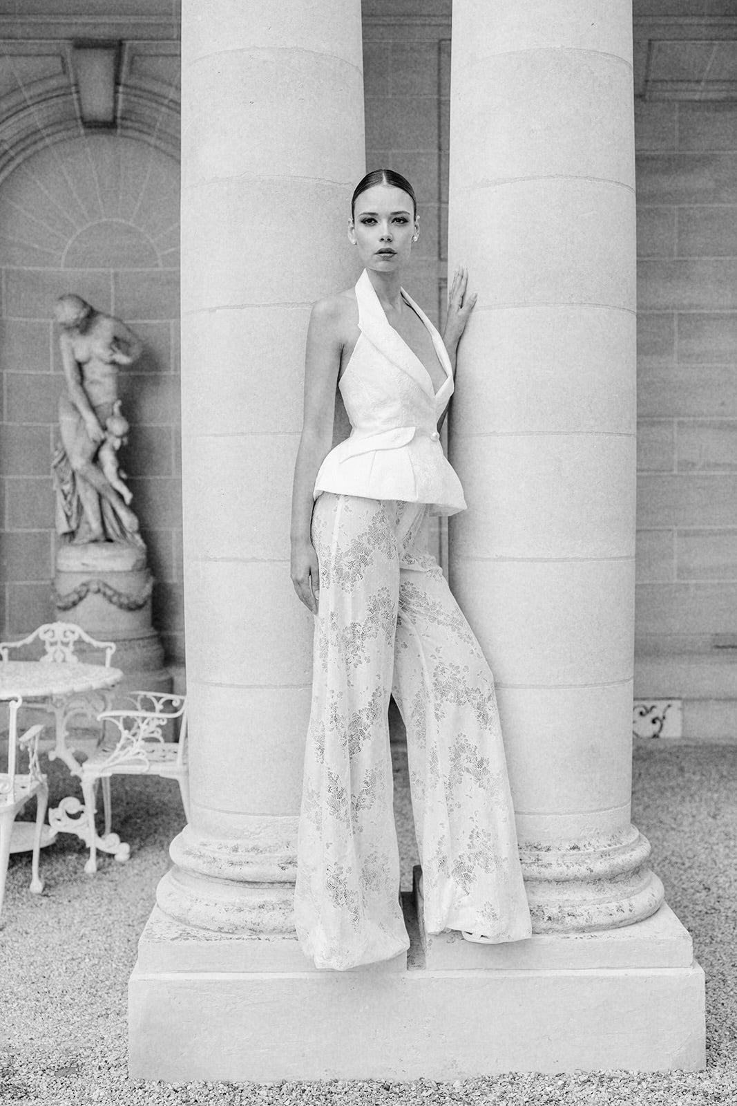 Tailleur pantalon en dentelle à l'inspiration rétro futuriste. La Veste à basque et emmanchures américaines s'inscrit dans la tradition couture années 50. Le pantalon est fluide et évasé sur le bas de la jambe. Fermeture sur le devant par un bouton bijou en forme de perle.