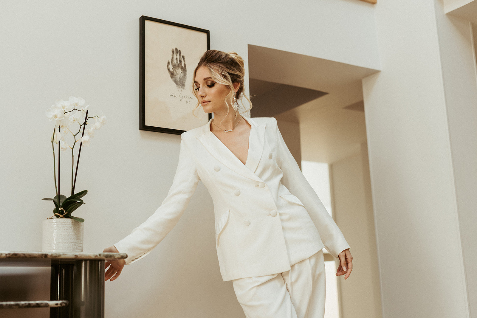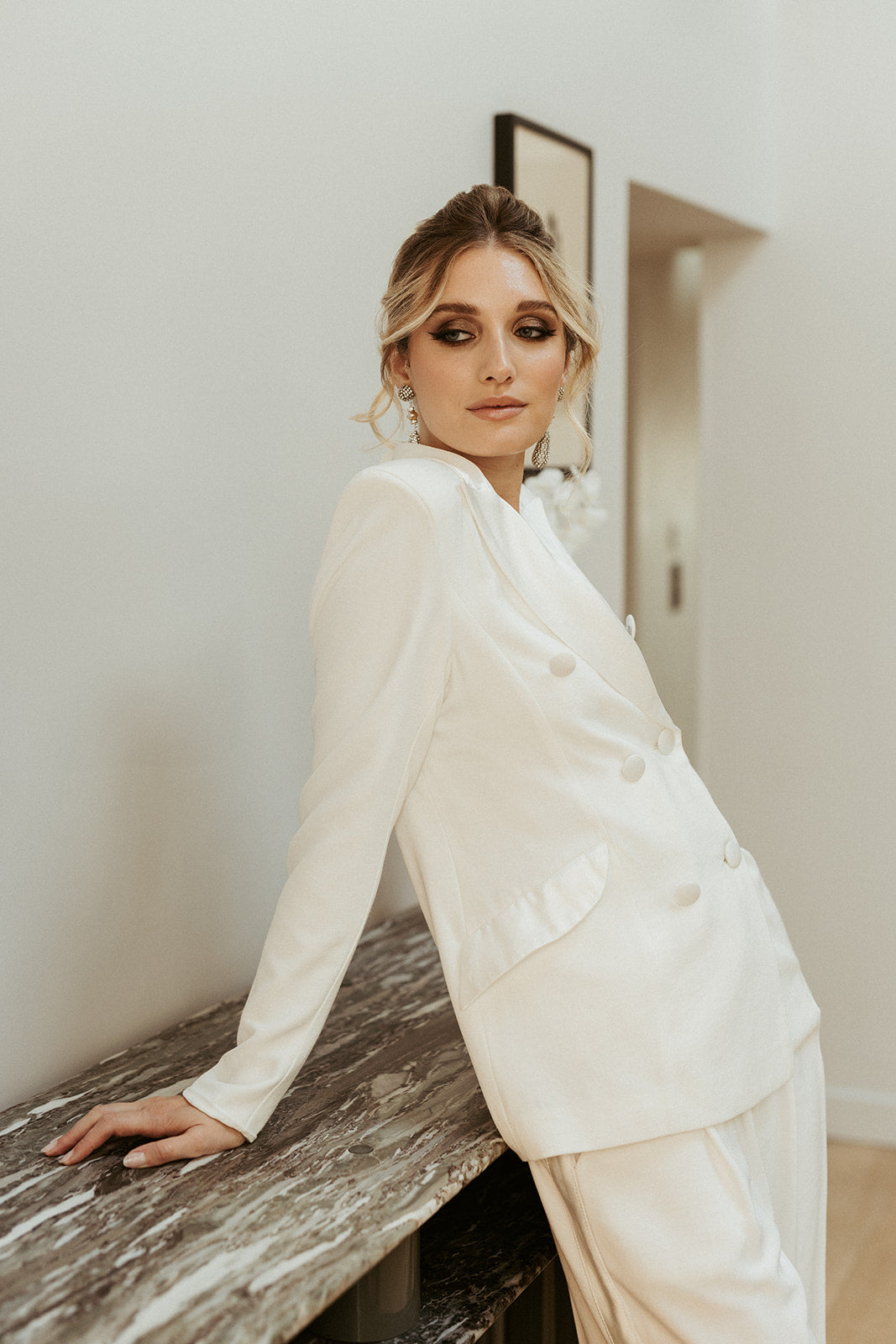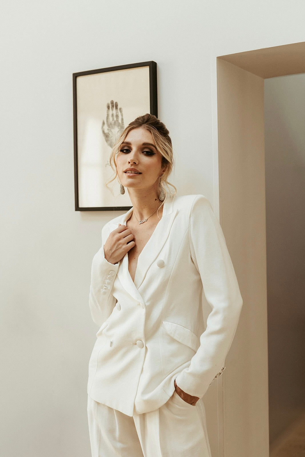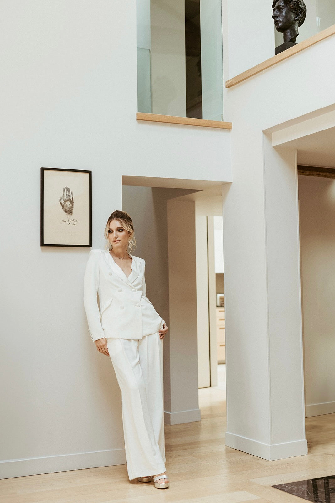 Démonstration d'élégance parisienne avec le smoking en crêpe envers satin Rive-gauche. La structure épaulée de la veste croisée associée à son cintrage fluide lui donnent cet inimitable style féminin masculin. Pantalon large à pinces avec baguettes de satin cousues sur les cotés. Rabats de poches; parementure et boutons recouverts de satin.