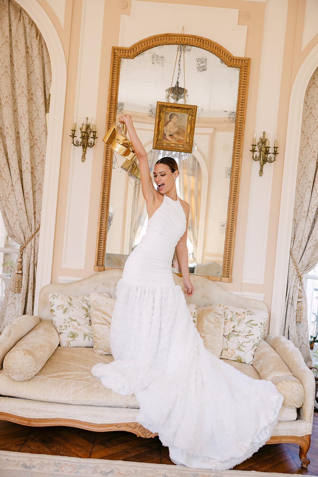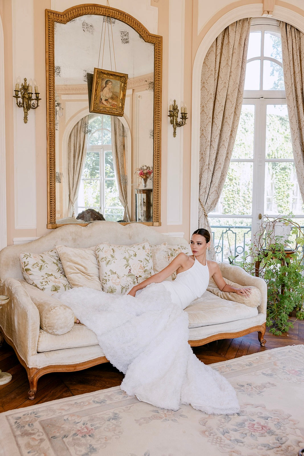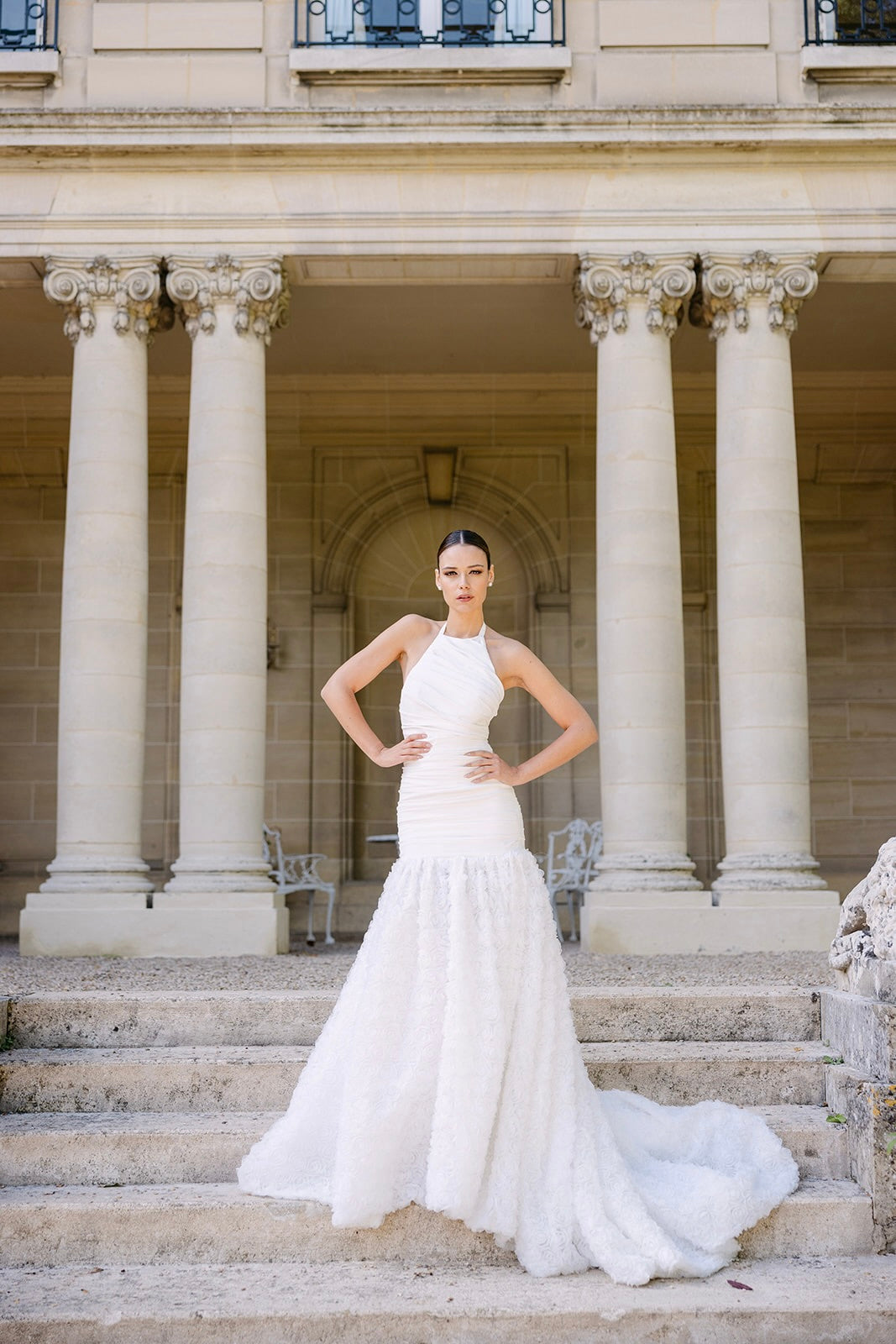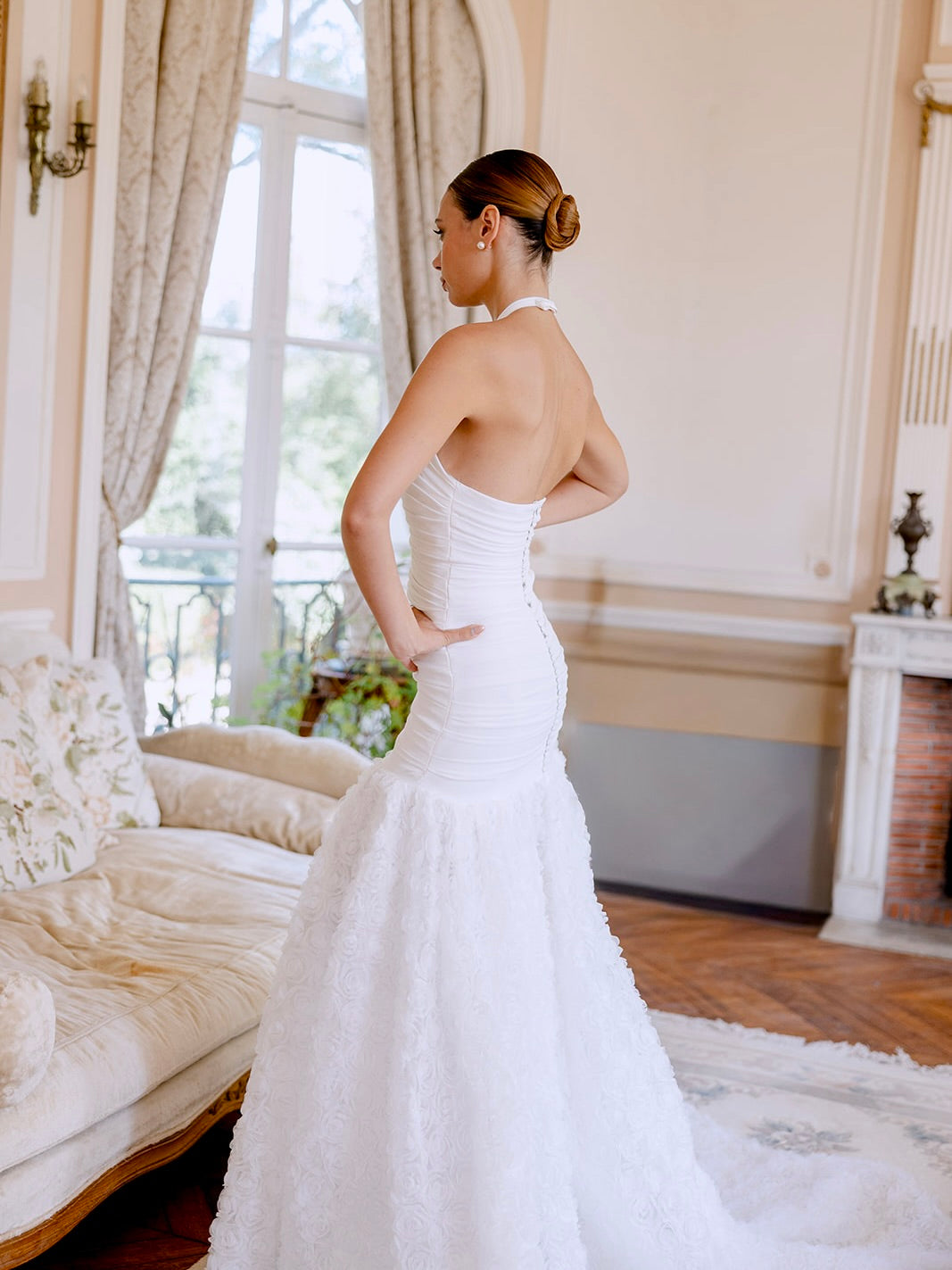 Exclusivement fabriquée sur mesure dans nos ateliers parisiens, la robe Souvenir affiche une attitude féminine et contemporaine. Le buste drapé en crêpe grain de poudre contraste avec la jupe à longue traine brodée de fleurs . Fermeture invisible dans le dos et petits boutons recouverts de tissu. Structure interne de la robe réalisée dans un tissu strech gainant.