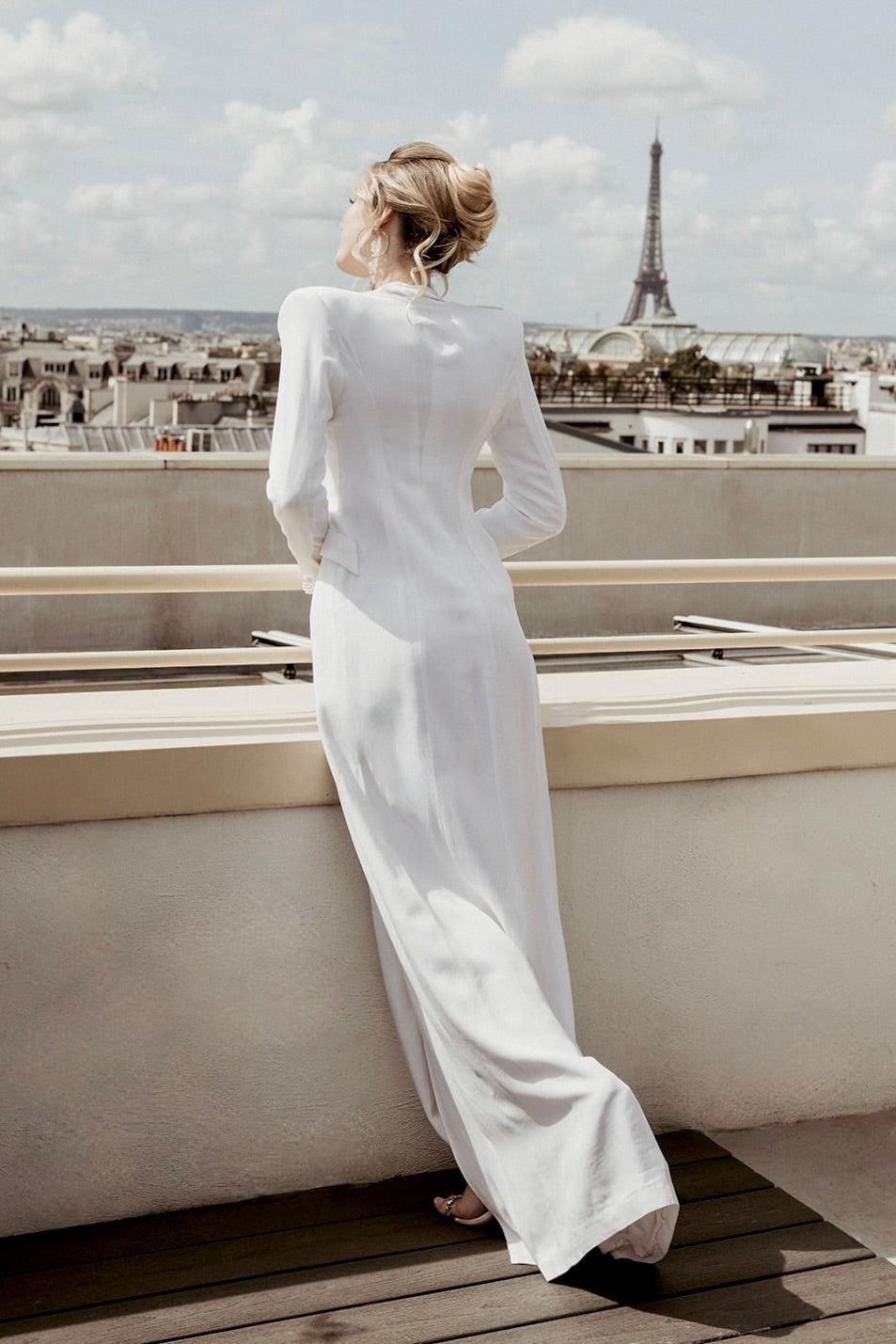 Allure intemporelle pour la robe smoking Vendôme. Epaulettes XXL, croisure six boutons et cintrage appuyé pour une silhouette empreinte d'élégance et de chic. Col, revers, boutons et rabats de poche en satin.