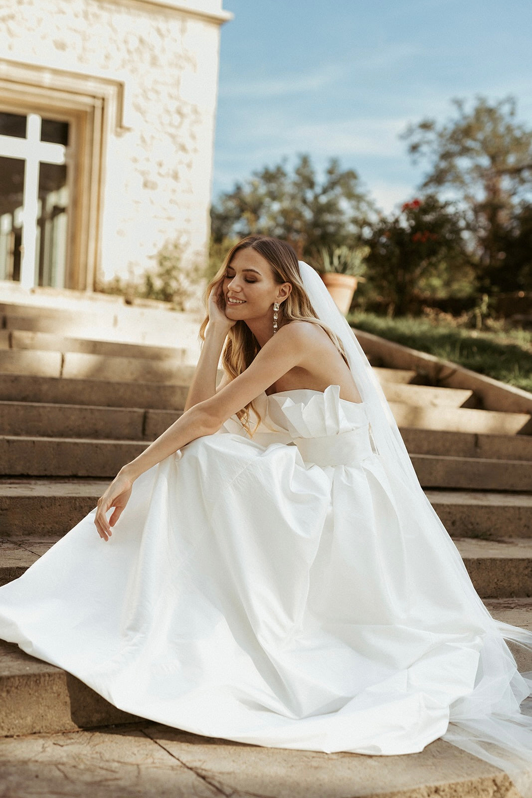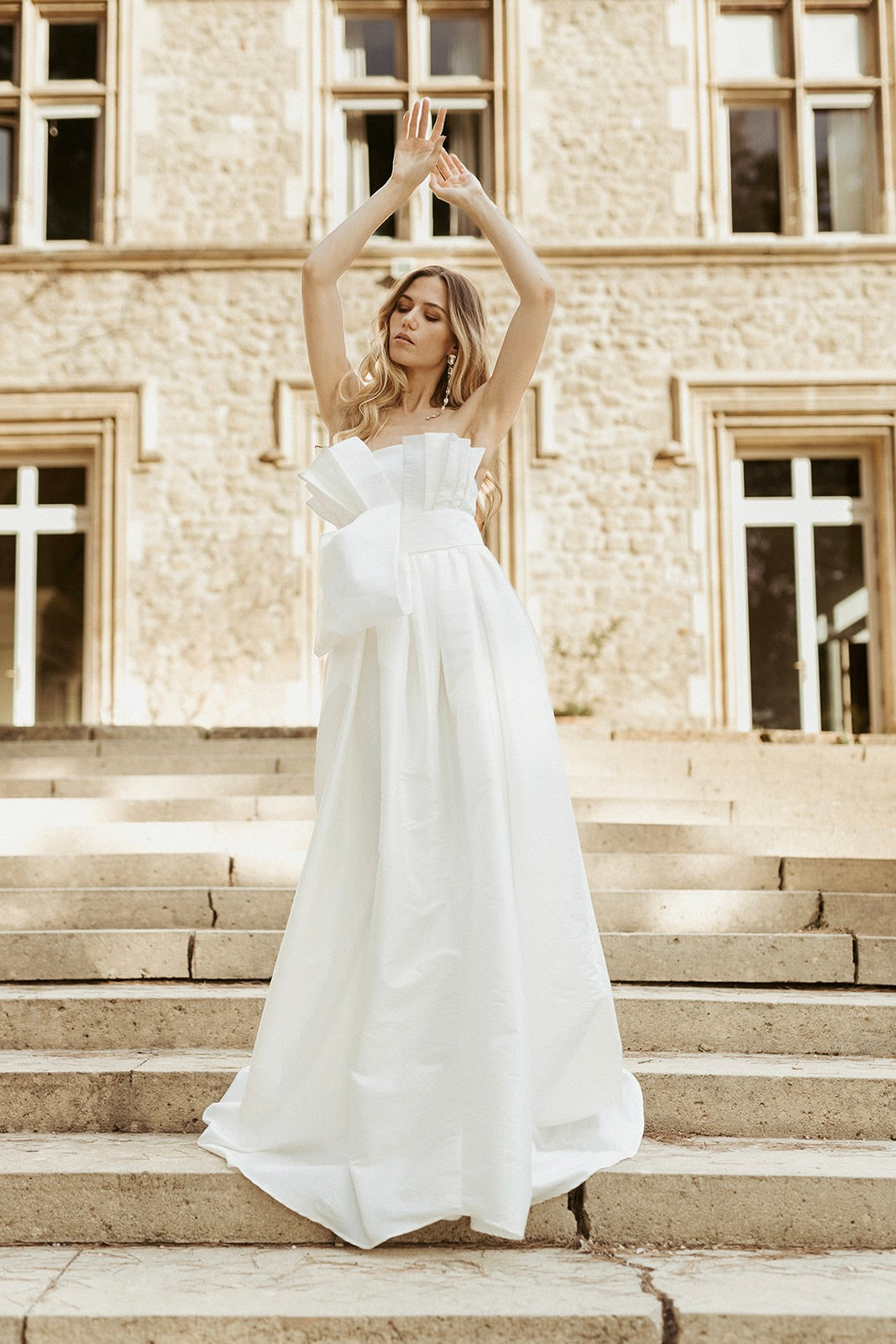 Pensée dans un style avant-gardiste, Vertige réinvente la robe de contes de fées. Bustier sculpture en tissu avec des baleines intégrées pour un maintien optimal. La taille est marquée par une ceinture large et une boucle spectaculaire symbole d'infini. La jupe dont le volume est obtenu par une succession de plis reste légère et permet d'évoluer d'évoluer en toute liberté.Le taffetas légèrement texturé apporte à l'ensemble beaucoup de luminosité.